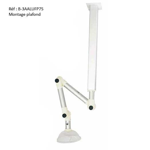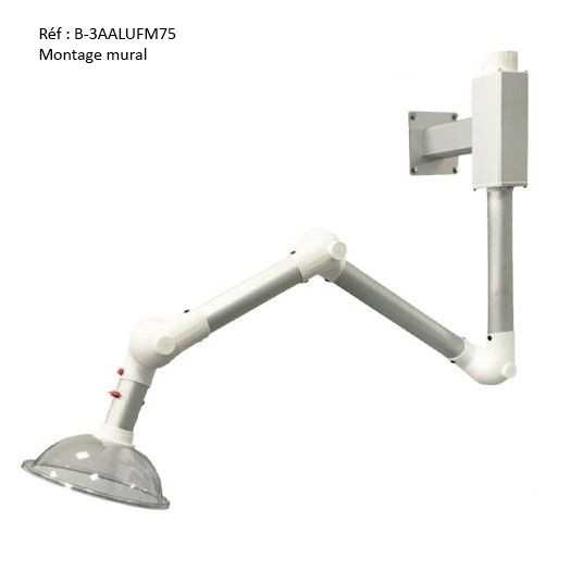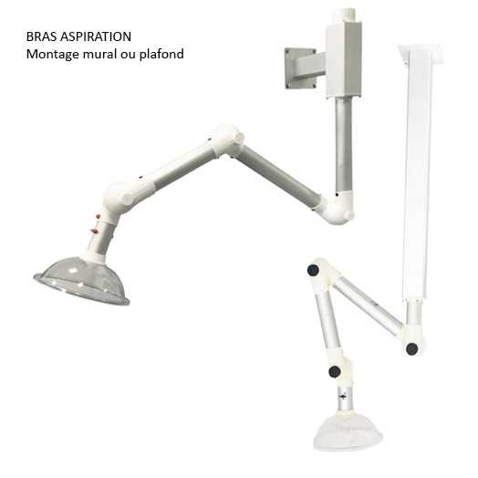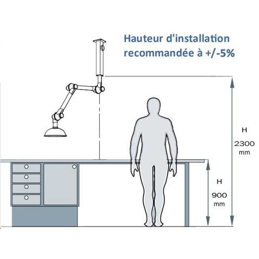 - Installation simplifiée : Bras à monter soit en mural soit en plafond, en fonction de votre agencement, de vos locaux et de votre réseau d'extraction. Un schéma d'installation est visible dans la fiche technique