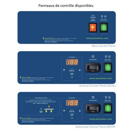 - Panneau de contrôle : Basic (Bouton marche/arrêt et voyant d'alarme) ou ACAL (Bouton marche/arrêt, voyant d'alarme et écran de visualisation live de la vitesse d'air d'aspiration) ou ADVP (Bouton marche/arrêt, voyant d'alarme, écran de visualisation live de la vitesse d'air d'aspiration et contrôle de la saturation du filtre)
